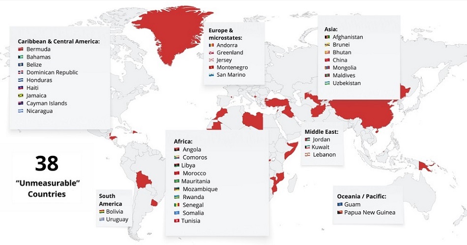 你可以把这 38 个国家/地区看作是本研究中的“无法测量”的国家/地区——它们存在于服务器列表、配置文件和IP地理位置信息中,但在测量中从未作为实际的出口国家/地区出现过。它们并非随机分布,而是聚集在地图的特定区域。按地区划分,这些区域包括: